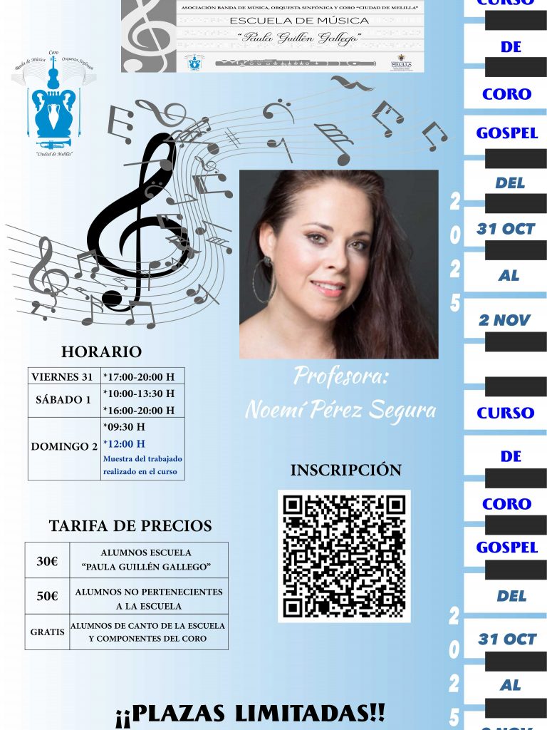 Tenemos el placer de anunciarles un curso de Coro Gospel con la profesora Noemí Pérez Segura, cantante con una larga y experimentada carrera que le llevó a especializarse en Jazz y Gospel en el mismo NY, en Brooklyn.